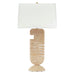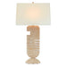 Icon-inspired sculptural table lamp is made of unfilled beige travertine. The Ancient Lore Lamp rests on a pillowed, semi-circle travertine base and barely visible brass feet for easy cord adjustability. Features an off-white, linen-like rectangular tapered hardback shade with rounded corners.