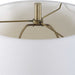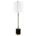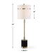 Standing tall on a luxurious round black marble base, this slender metal buffet lamp is finished in an antique brass. The sleek and contemporary design is finished with a round off-white shade. Perfect for illuminating your buffet table, console or any ot