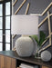Details | Made of polyresin with drum hardback fabric shade, Warm gray and white antiqued finish, 3-way switch, 1 E26 socket, type A bulb recommended (not included); 150 watts max or CFL 25 watts max; UL Listed, Assembly required | |