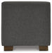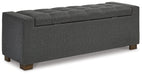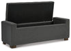 Details Polyester upholstery in gray, Wood legs with brown finish, Tufted seat cushion, Hinged seat, Interior storage