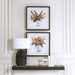 Bursting With Vibrant Color, These Contemporary Floral Pieces Brighten Any Space. The Watercolor Style Prints Exhibit Bright Shades Of Apricot And Magenta Contrasted By Deep Sage And Coastal Blue Tones. Each Floral Bouquet Is Accented By A White Fabric Mat And A Petite Matte Black Wooden Frame Under Glass. Artwork By Samuel Dixon.
