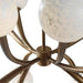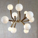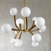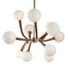 A celestial centerpiece for any room: twelve moon-like spheres of white bubble glass extend from curved, tapered arms in a light antique brass finish. 12-60 watt max candelabra sockets. Bulbs not included. Supplied with 20' wire, 3-12" stems and 1-6" stem for adjustable installation.
