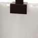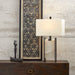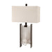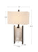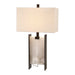Thick slab of ivory marble with subtle rust veining and hand chiseled edges, suspended between thick steel supports, finished in a distressed dark bronze with gold highlights. The rectangle hardback shade is a white linen fabric.