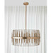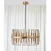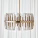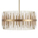 A band, in rich brass finish, holds an evolution of metal beams and dancing frosted acrylic rods, giving the illusion of weightlessness. 8-60 watt max, candelabra sockets. Bulbs not included. Supplied with 20' wire, 3-12" stems and 1-6" stem for adjustable installation.