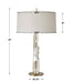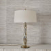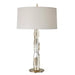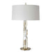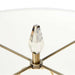The facets of hand-cut optic crystal interact with light, creating subtle effects on or off. The asymmetrical organic shape rests on a round steel plate base with brass finish. A round tapered hardback shade in a white linen fabric provides the perfect counterpoint.