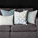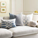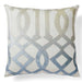 A dashing fret design made of ombre crushed velvet in shades of rich blue to white is applied to a white slubbed cotton ground. Design is on both sides with an invisible zipper. 95/5 feather down filler included. Recommend professional dry clean only.