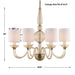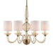Inspired by chandeliers made in Murano Italy during the late 1940's, the eight arm Palazzo Chandelier is made of champagne-color blown glass with brass-finished accents and white faux silk tapered hard back shades. 8-60 watt max candelabra sockets. Bulbs not included. Supplied with 20' wire, 3-12" stems and 1-6" stem for adjustable installation.
