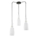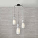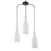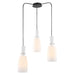 Three frosted matte opal glass pendants are suspended by antique brass pins from a black canopy. 3-60 watt max Edison sockets. Bulbs not included. Each pendant supplied with 15 feet of black fabric-covered cord, to be adjusted to your desired length for adjustable installation.