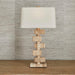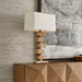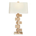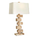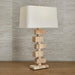 Playfully placed blocks of beige unfilled travertine stack up to make a beautiful lamp. The soft curves of the blocks are mimicked on the curved corners of the rectangular tapered hardback shade. The shade is covered in an off white linen texture fabric, and is topped with a travertine finial.