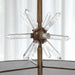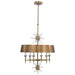 Six candelabra bulbs provide soft light diffused by a stylish metal shade and illuminates starbursts made of rich man made quartz crystals. Subtly and sophisticated designed arms are made of steel with antique brass finish and sit beneath an antique brass shade. Thoughtfully scaled to work in both large and smaller spaces the bottom quartz starburst can be removed for spaces with lower ceiling clearance. 6-60 watt max, candelabra sockets. Bulbs not included. Supplied with 15' wire, 3-12" stems, and 1-6" stem for adjustable installation.