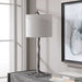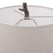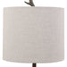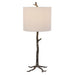Hand cast with an organic base, this rustic lamp brings the look of nature indoors. Finished in a dark gunmetal and accented with gold highlights. The round hardback drum shade is a light beige linen fabric with natural slubbing.