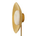 Highly polished concave disc of gold-finished stainless steel envelop a ring carved from one piece of solid alabaster, creating a phenomenal and functional light source. Includes dual mount option with 8' of wire & plug, in-line dimmer switch, and 3-12" metal cord covers for easy plug in installation or it can be wired directly to an outlet box as a sconce. No bulb required with the built-in LED light source; 7.5 watt, 2700K, CRI of 92, 451 Lumens, 50,000 estimated hours of illumination. Compatible with Lutron DVCL-153P dimmer.