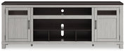 Make a farmhouse-inspired statement with this TV stand. It’s beautifully crafted to stand the test of time, with a planked effect and clean two-tone finish that lend a relaxing vintage feel. With two cabinets (each with an adjustable shelf) and an open cubby, it offers plenty of storage to house all of your electronic needs. Enhancing the experience: the optional fireplace insert (sold separately) brings a touch of warmth and beautiful ambiance to your living room.