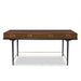 The Glide Desk is made of hardwood and American walnut veneer in a satin finish. Exclusively designed pulls are made from solid brass. Features three drawers with mitered corners, ensuring no visible lines when closed. The center drawer flips down for easy access to a keyboard. The top provides ample working and writing space. Features an apron with distinctive curve above the scaffold-like legs. Stretchers are finished in a gold brass finish.