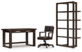 Details H556-44: Made with hardwood solids, oak veneer and MDF substrates, Dark brown wood-tone finish, 2 smooth-gliding drawers, Cutout for cord management, Assembly required, H556-01A: Made with solid wood frame, Dark brown wood-tone finish, Foam cushioned seat and backrest with faux leather upholstery, Adjustable height, Casters for easy mobility, Assembly required, H556-70: Made with hardwood solids, oak veneer and MDF substrates, Dark brown wood-tone finish, 4 shelves, Assembly required,