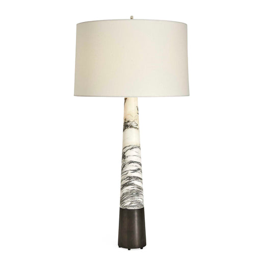 RevelationA long tapered column of stunning Arabescato marble pierces through a round linen tapered hardback shade and terminates as a tapered finial. The ba...