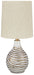 Shine a contemporary spotlight on your good taste with this table lamp. The antiqued white and goldtone finish of the metal lamp adds texture and interest to any space. With a modified drum shade, this light will illuminate your decor with style.