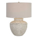 Inspired By Antique Pottery, This Ceramic Table Lamp Features An Aged Stone Finish With Character Distressing And Dark Undertones, Accented With Plated Brushed Nickel Details. The Drum Shade Is Covered In A Light Gray Linen Fabric.