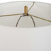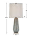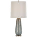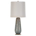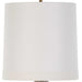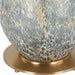 A traditional profile gets a luminous update, with a blown glass body that resembles our planet's star-filled atmosphere. The aqua glass has a volcanic white and gold matte finish and rests atop a brass finished footed base. A tall round tapered hardback shade features white faux silk edged by wide self trim.