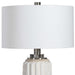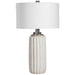 A Nod To Old-world Style, This Ceramic Table Lamp Features A Distressed Cream And Beige Crackle Glaze With A Deep Ribbed Texture, Accented By Brushed Nickel And Crystal Details. A White Linen Fabric Drum Shade Completes The Look.