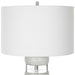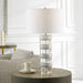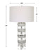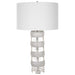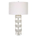 The Band Together Table Lamp Displays A Unique Pairing Of Stacked Thick Crystal And Bleached Wooden Discs, Accented By Brushed Nickel Plated Iron Details. The Lamp Is Topped With A White Fabric Covered Hardback Drum Shade.