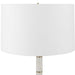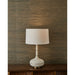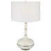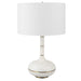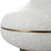 Punctuated with antique brass bands, the base is a white terrazzo made of ground marble and white glass. It rests on a metal base, and a round tapered hardback shade in white linen completes the look.