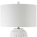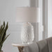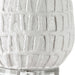 A Modern Take On Old World Style, This Table Lamp Features A Textured, Aged White Ceramic Base With An Organic Grid Design Displayed On A Thick Crystal Foot With Polished Nickel Accents. The Lamp Is Paired With A White Linen Drum Shade.
