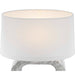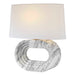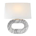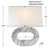 An mini oval of Arabescato marble features concentric rings on front and back. Made from a single block of marble, it has an oval tapered hardback white faux silk shade, finished with 0.75" self trim. A braided taupe fabric cord drapes from the light socket and has an in-line dimmer.