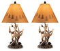 Details Set of 2 table lamps, Richly rustic base crafted of poly resin, Paper silhouette shade with decorative design, Each table lamp takes 100-watt max bulb or CFL 23 watts max; UL Listed, On/off pull chain switch, Clean with a soft, dry cloth, Assembly required