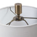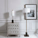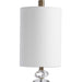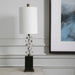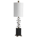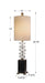 Stacked, thick crystal eggs, separated by antique brass steel columns, displayed on a chunky black marble foot. The tall round hardback shade is a light beige linen fabric.