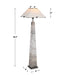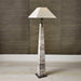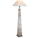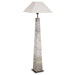 An expansive pyramid of tonal gray travertine rests atop a dark bronze-finished metal plate. The casual light beige, tapered square, hardback shade is attached to the column with a dark bronze clamp, for a more rustic approach. Four feet at base allow for cord control.