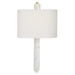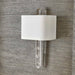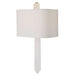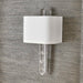 A stunning, man-made crystal quartz point sits below the sockets, all finished in Rich Brass. The silken white waterfall hardback shade features a 1" self trim and sits flush to the wall to direct light vertically. The crystal finial is similarly cut, giving the illusion of a singular crystal rising through the shade. 2-60 watt max, candelabra sockets. Bulbs not included.