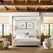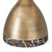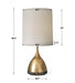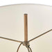 An impressive light antique brass-finished steel body dramatically tapers to a slender neck, creating a dramatic juxtaposition. It all rests, perfectly balanced, on a Michelangelo marble base with white and gold veining, a pattern that will naturally vary from lamp to lamp. The elongated round tapered hardback shade features white linen tailored with a double-banded self-trim.
