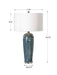 Heathered Blue Ceramic Featuring Subtle Decorative Embossing With Silver Ivory Highlights And Rust Undertones Accented With Brushed Nickel Details And A Crystal Foot. The Round Hardback Drum Shade Is A White Linen Fabric. Due To The Nature Of Fired Glazes On Ceramic Lamps, Finishes Will Vary Slightly.