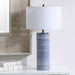 Showcasing Trendy White And Indigo Blue Hues, This Ceramic Table Lamp Has A Striped Glaze With Polished Nickel Accents. The Round Hardback Drum Shade Is A White Linen Fabric.