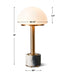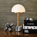 Mushrooms appear everywhere, and you will want these fun mini lamps everywhere in your home. Standing at just 15 inches high, it features an opal glass shade, an acid column, and a rounded gray travertine base with a footed acid bronze plate. Utilize the in-line dimmer switch for optimal lighting options.