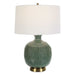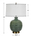 This Unique Ceramic Lamp Showcases A Gracefully Curved Base Finished In A Crackled Aged Green Glaze With Dark Bronze Undertones, Accented With Antique Brass Plated Details. A Slightly Tapered Round Shade Made With A Crisp White Linen Fabric Completes The Piece. Due To The Nature Of Fired Glazes On Ceramic Lamps, Finishes Will Vary Slightly.
