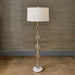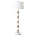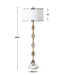 The finial and five base spheres are comprised of gold-flecked Murano style glass encased within clear fluted glass. Scooped brass finished details separate each sphere then rest atop a marble base and brass plate with feet. The round faux silk shade contains a one inch self trim on top and bottom.
