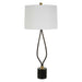 This Tall Table Lamp Has A Wishbone Shaped Iron Base Finish In A Rustic Black Paired With Antique Brass Plated Details Displayed On A Honed Black Marble Foot. The Slightly Tapered Round Shade Is Covered In A Crisp White Linen Fabric.
