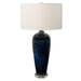 Reminiscent Of The Evening Sky, This Beautiful Table Lamp Features An Art Glass Base With Shades Of Navy, Cobalt And White Accented By An Elegant Crystal Foot And Polished Nickel Plated Details. A Crisp White Hardback Drum Shade Completes The Look.