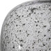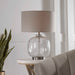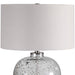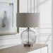 Modern Style Table Lamp Features A Translucent Art Glass Base With Abstract Black Flecks Throughout, Accented With Brushed Nickel Details. The Round Hardback Drum Shade Is A Light Gray Linen Fabric With Natural Slubbing.