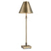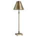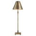 Illuminate your home with style and grace with this simple but elegant buffet-style lamp. The all metal body is finished in an antique brass, complemented with a tapered metal shade that casts a warm and inviting glow wherever it is placed. Diamond knurl