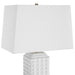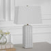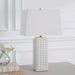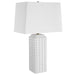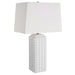This fun, 25" square body ceramic table lamp is designed with organic diamond shaped knobs and finished in a gloss white. The rectangular hardback shade is a white linen fabric with light slubbing.