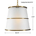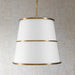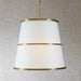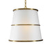 Three round hoops of light antique brass-finished steel encircle the round tapered white linen shade. The four lights are softened and concealed with a bottom diffuser. 4-60 watt max Edison sockets. Bulbs not included. Supplied with 15' wire, suspended by 3' of custom chain with a combination of rectangular and round links for adjustable installation.