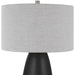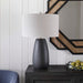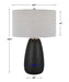 The Twilight Table Lamp Features A Ceramic Base With A Subtle Carved Gridline Texture, Finished In A Satin Black Glaze And Accented By Brushed Nickel Plated Details. The Hardback Drum Shade Is Covered In A Light Gray Linen Fabric.