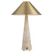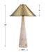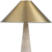 A dramatic tapered metal shade gleams in a light antique brass finish. The tapered column body of honed unfilled beige travertine features a solid brass dimmer switch conveniently located at the base. The brass-finished base plate includes barely visible feet useful for cord concealment.