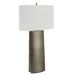 This Contemporary Sculptural Design Showcases A Tapered Silhouette With A Deep Channel Down The Sides, Finished In A Dark Steel Gray. The Oval Drum Shade Is Covered In A White Linen Fabric With Natural Slubbing.