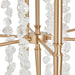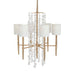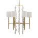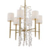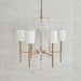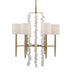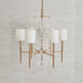 Organic shapes of glass, reminiscent of clear tumbling ice, cascade down the middle of the Waterfall Chandelier, refracting light from the six surrounding torch arms. With beautiful hardback shades, the chandelier is finished in a rich brass with delicate detailing throughout. 6-60 watt max candelabra sockets. Bulbs not included. Supplied with 15' wire, 3-12" stems and 1-6" stem for adjustable installation.