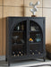 Details | Made with oak veneer, hardwood solids and engineered wood, Black and natural brown finish, Door pulls with black finish, 2 doors with arched glass inserts, 2 rows of wine bottle racks, 3 wine glass racks, 4 adjustable shelves, Minor assembly required, simply attach drawer pulls and legs | |