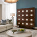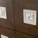The stunningly beautiful Botanical Cabinet has bifold doors featuring delicately carved depictions of garden foliage and flowers framed in figured eucalyptus. Doors open and fold back flat against itself to reveal a roomy cabinet. It is large enough to hold up to a 72" flat screen television. The lower cabinet has two compartments with one adjustable shelf each. Both the internal and external surfaces are veneered in figured eucalyptus.